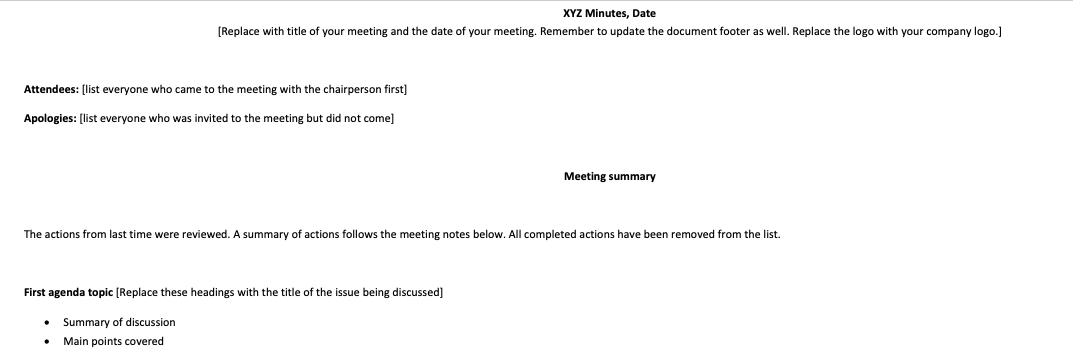 - It includes 'Swipe copy' email text you can use for meeting-related emails such as invites and sending out agendas and minutes.